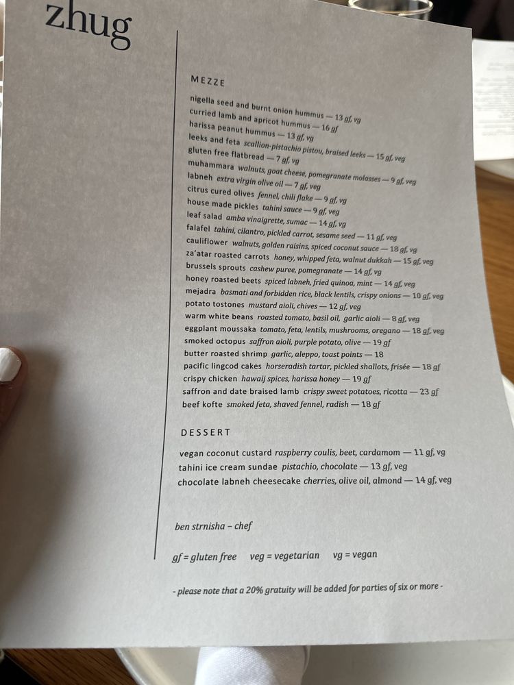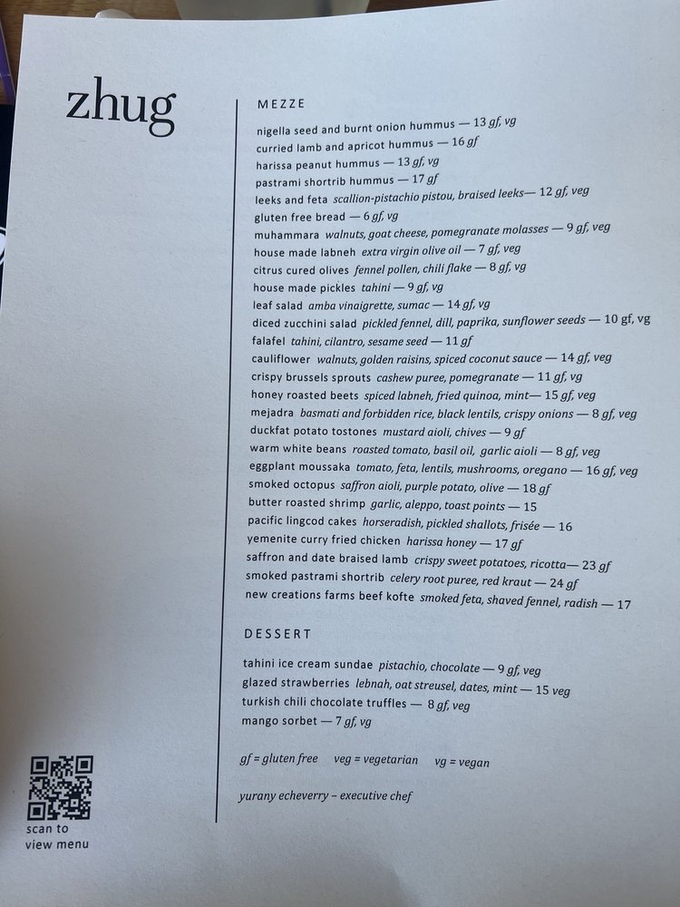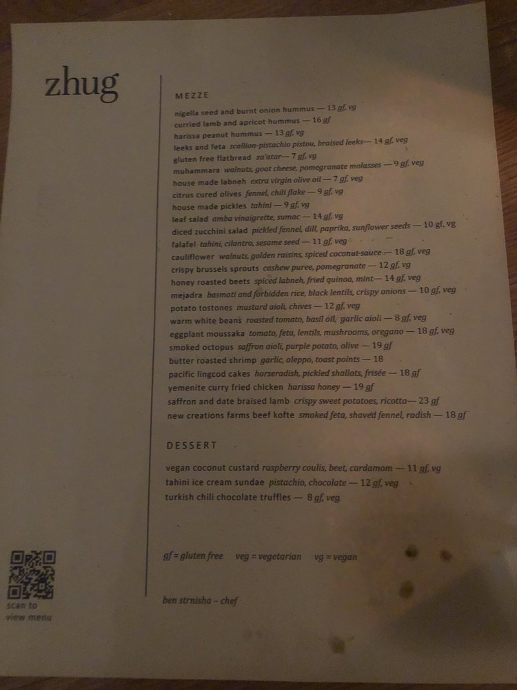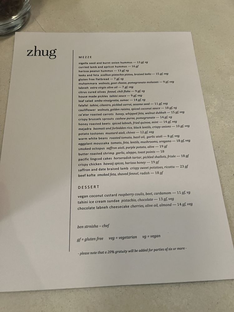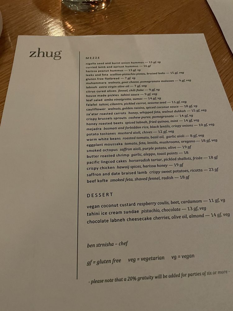 Each dish is meticulously crafted, blending the richness of Middle Eastern spices with modern flair. While some items receive mixed reviews, the overall ambiance and dedicated service elevate the dining experience. Whether you're celebrating a special occasion or enjoying a night out with friends, Zhug promises not only delectable food but also a warm, intimate vibe that perfectly complements the culinary delights on your table.